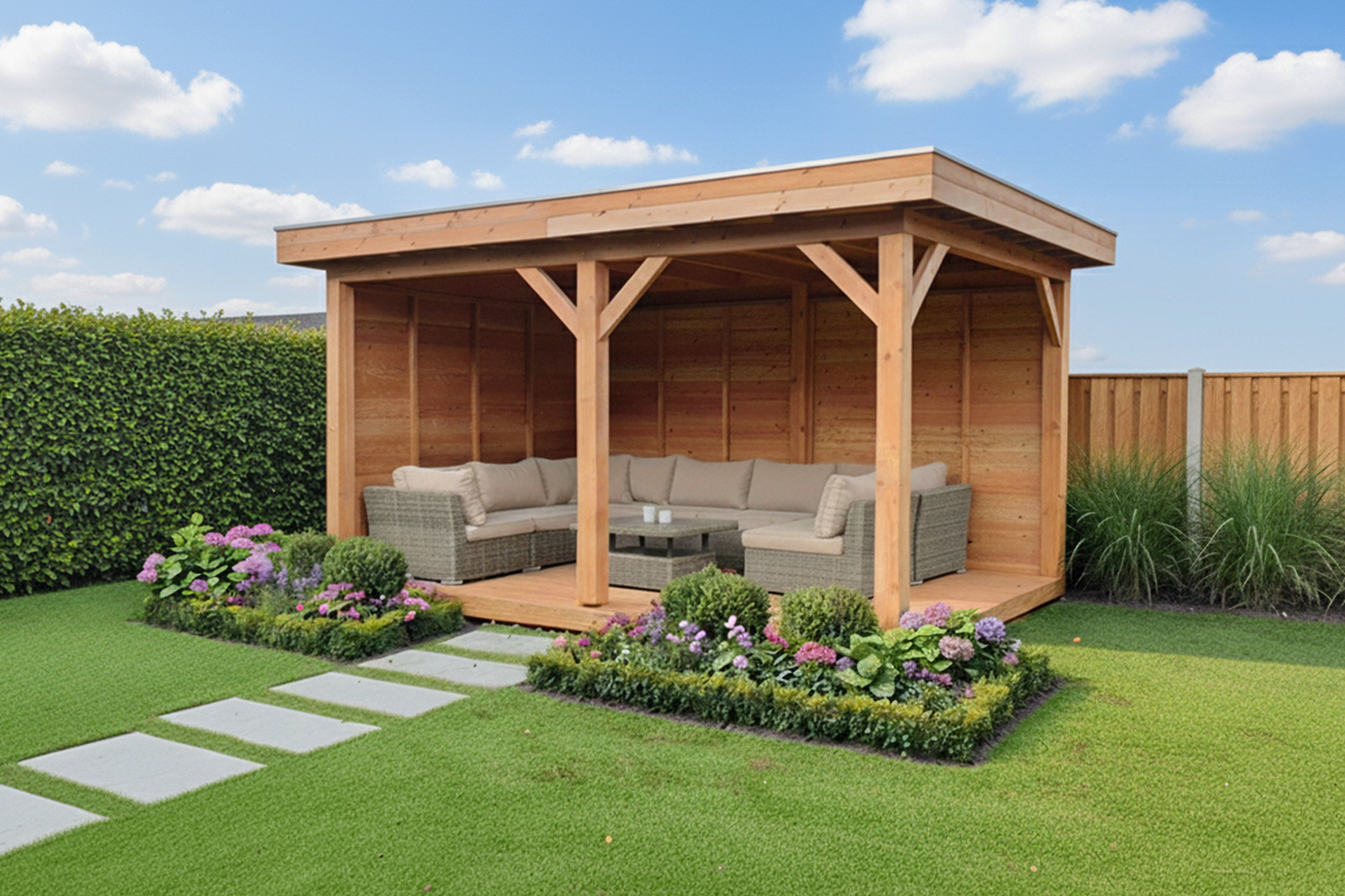 De wand wordt gemaakt van douglas geimpregneerd NE vurenhout en bestaat uit 15 planken met een dikte van 28 mm, 2 bevestigingsbalken van 44x44 mm, 2 afwerklijsten van 60x18 mm en alle benodigde bevestigingsmaterialen. U kunt kiezen voor 1, 2 of 3 dichte wanden (links, rechts en achter).